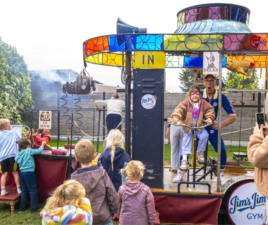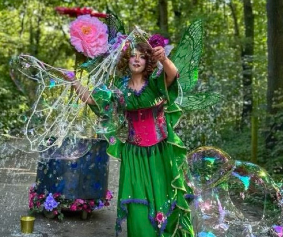 Betreed de fascinerende wereld van het Bellenwonder! Een betoverende ontmoeting met de kunst van reuzenbellen, gedragen door een mobiel karretje getooid met weelderige bloemen en omringd door de klanken van twinkelende muziek. Je vindt de show op de Natuurspeelplaats.